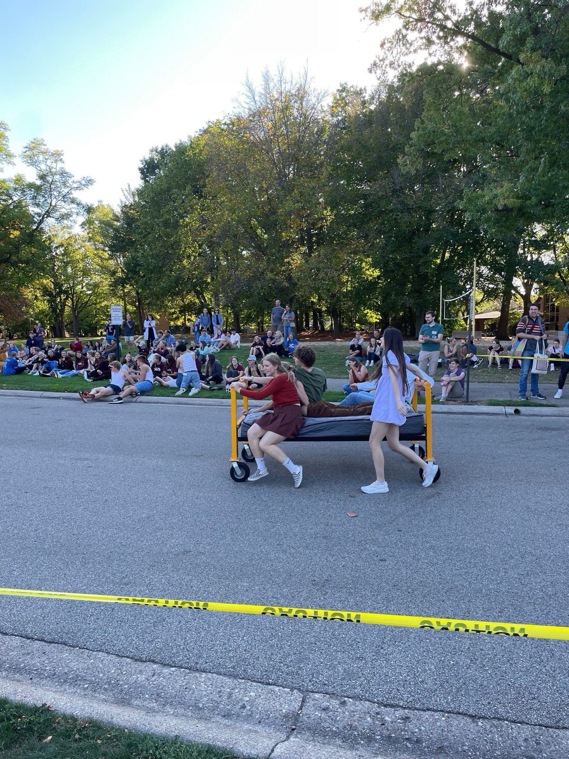 Und nun zum Homecoming-Wochenende: Den Begriff kannte ich selbst nur aus amerikanischen Filmen und ich war gespannt was man dabei eigentlich feiert. Hauptsächlich geht es an dem Wochenende um das Zusammenkommen von ehemaligen und aktuell Studierenden an der Uni. Außerdem sind auch die Eltern, Freunde und Geschwister der Studierenden eingeladen. Insgesamt ist es also ein sehr voller Campus an dem Wochenende und es gibt zahlreiche Veranstaltungen. Am Freitag gab es zum Beispiel das Bed Race (Bettenrennen), bei dem Teams eine Person auf einem Bett mit Rollen möglichst schnell ins Ziel bringen müssen. Das war super lustig!